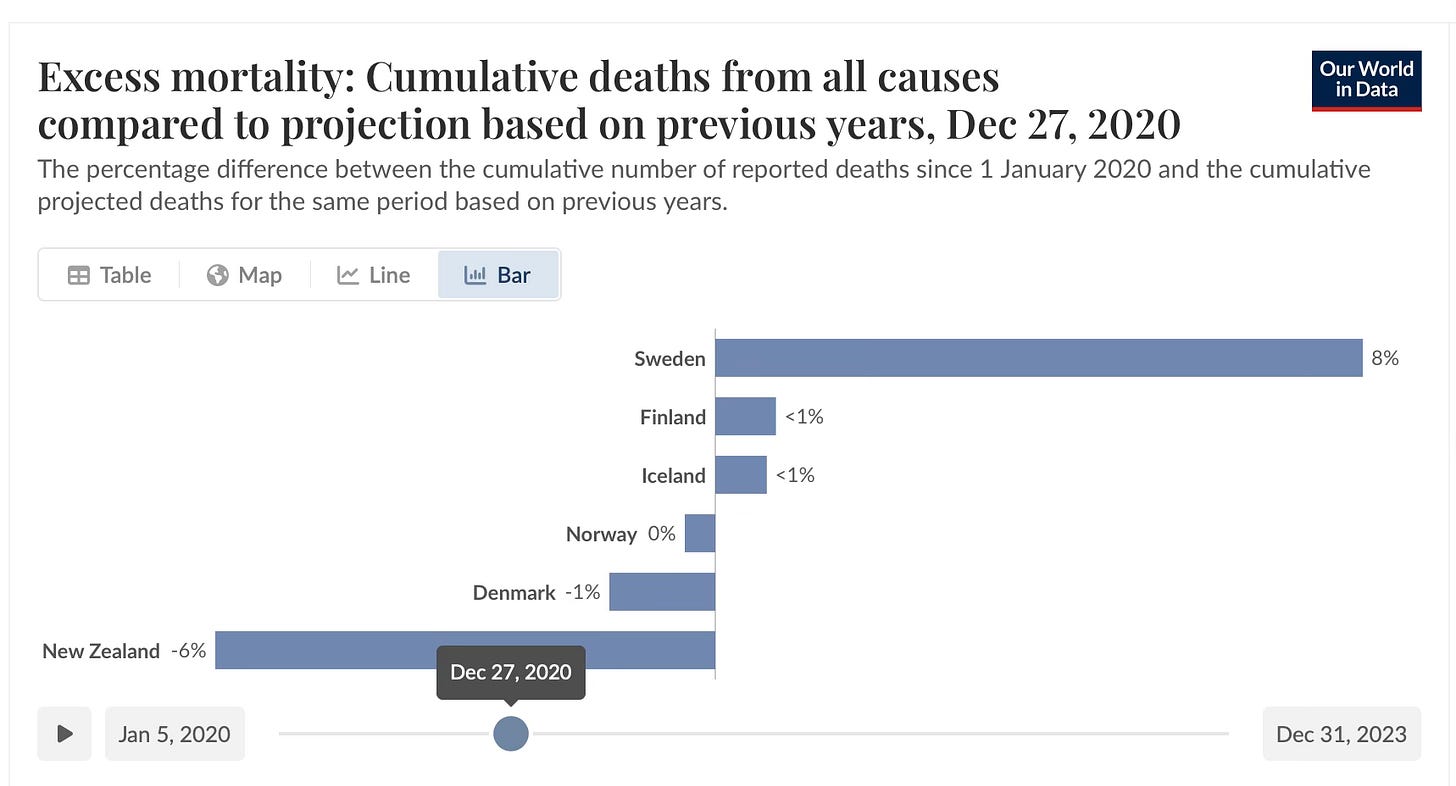 And then, Sweden. Revisionists love to throw lines like “Sweden never mandated masks or staying at home, and kept most schools open (…) Yet its excess-death rate after a year of COVID was one of the lowest in Europe.” (This from The Economist.) But is Europe a good general comparison to Sweden, considering its unique Nordic characteristics? What about the other Nordic countries? And, to use an extreme case as a control, consider New Zealand (another small, democratic, peaceful, highly homogeneous developed country), which imposed stringent COVID-19 restrictions.